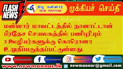 மன்னார் மாவட்டத்தில் நானாட்டான் பிரதேச செயலகத்தில் பணிபுரியும் 3 ஊழியர்களுக்கு கொரொனா உறுதிப்படுத்தப்பட்டுள்ளது.
