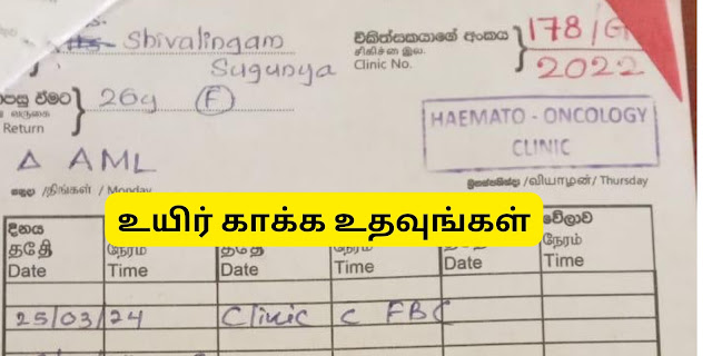 (Blood cancer) அன்பான உறவுகளே என்போலவும் உங்களைப்போலவும் இவ்வுலகில் வாழத்துடிக்கும் ஒரு ஜீவனே சுகன்ஜா வயது 26. நடுத்தரக்குடும்பத்தில் பிறந்து கடந்த 3 வருடங்களாக இரத்தப்புற்று நோயினால் பாதிக்கப்பட்டு ஓரளவு உடல் நிலை தேறிய நிலையில் வாழ்ந்து கொண்டிருந்தவர்